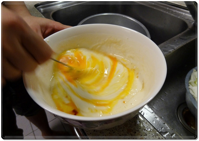 加一顆蛋到麵糊裡。